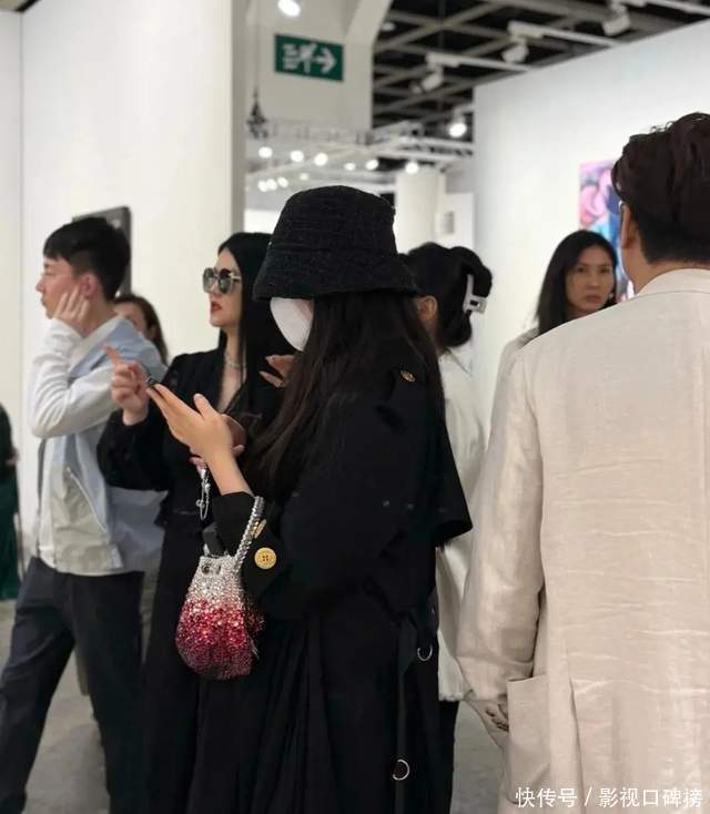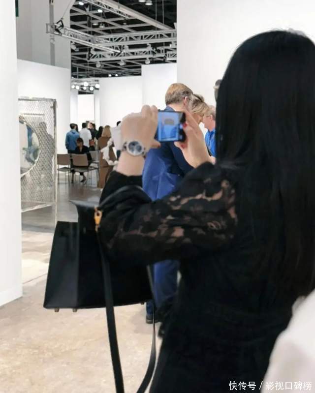 在现场看到自己喜欢的作品拿起相机拍下,另一只手拎着名牌包包。